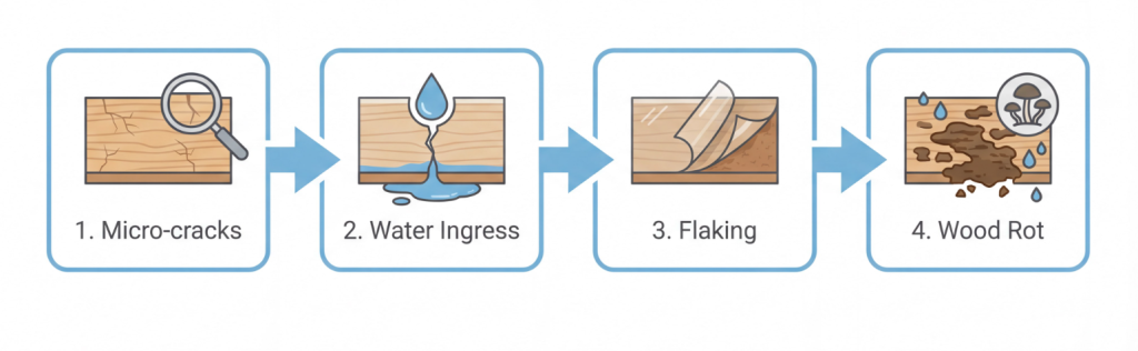 You will notice small, hair-thin lines appearing along the grain of the wood when the topcoat loses its flexibility. These micro-cracks act as channels for liquid water to enter the timber, leading to internal pressure and eventual fiber separation.