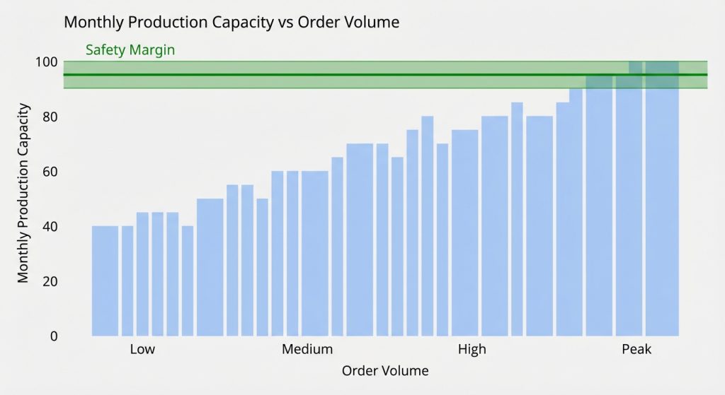 Key Takeaway: Always select a manufacturer whose total capacity is at least 30% greater than your current order volume to ensure you are never the “low priority” client.