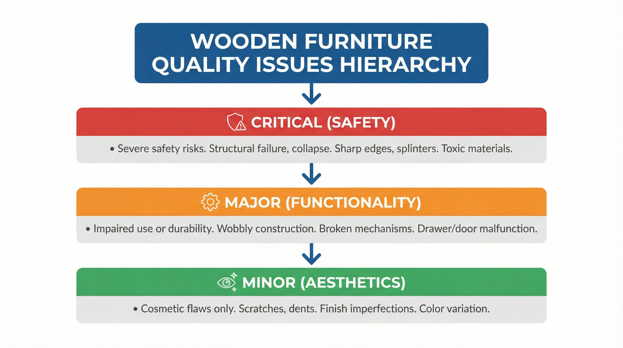 Wooden furniture quality issues are typically categorized into critical, major, and minor defects based on their impact on safety and functionality. Critical defects involve safety hazards such as sharp edges or structural instability that could lead to collapse. Major defects, while not necessarily dangerous, render the product unfit for its intended use, such as drawers that won’t open. Minor defects are usually cosmetic, affecting the aesthetic appeal without compromising the utility of the piece.
