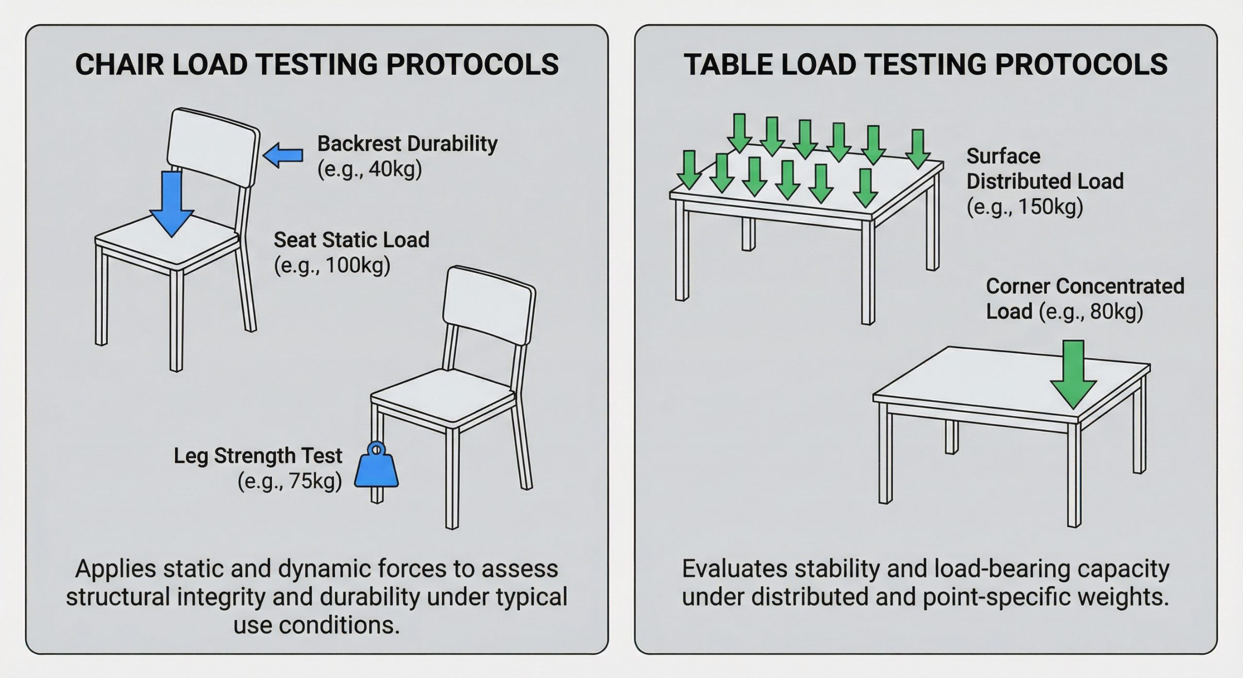 Drop tests essential for simulating accidental falls involve dropping a weight from a specific height onto the seat or backrest to observe shock distribution. This protocol evaluates the resilience of leg-to-frame connection points and identifies weaknesses that could lead to breakage during use.