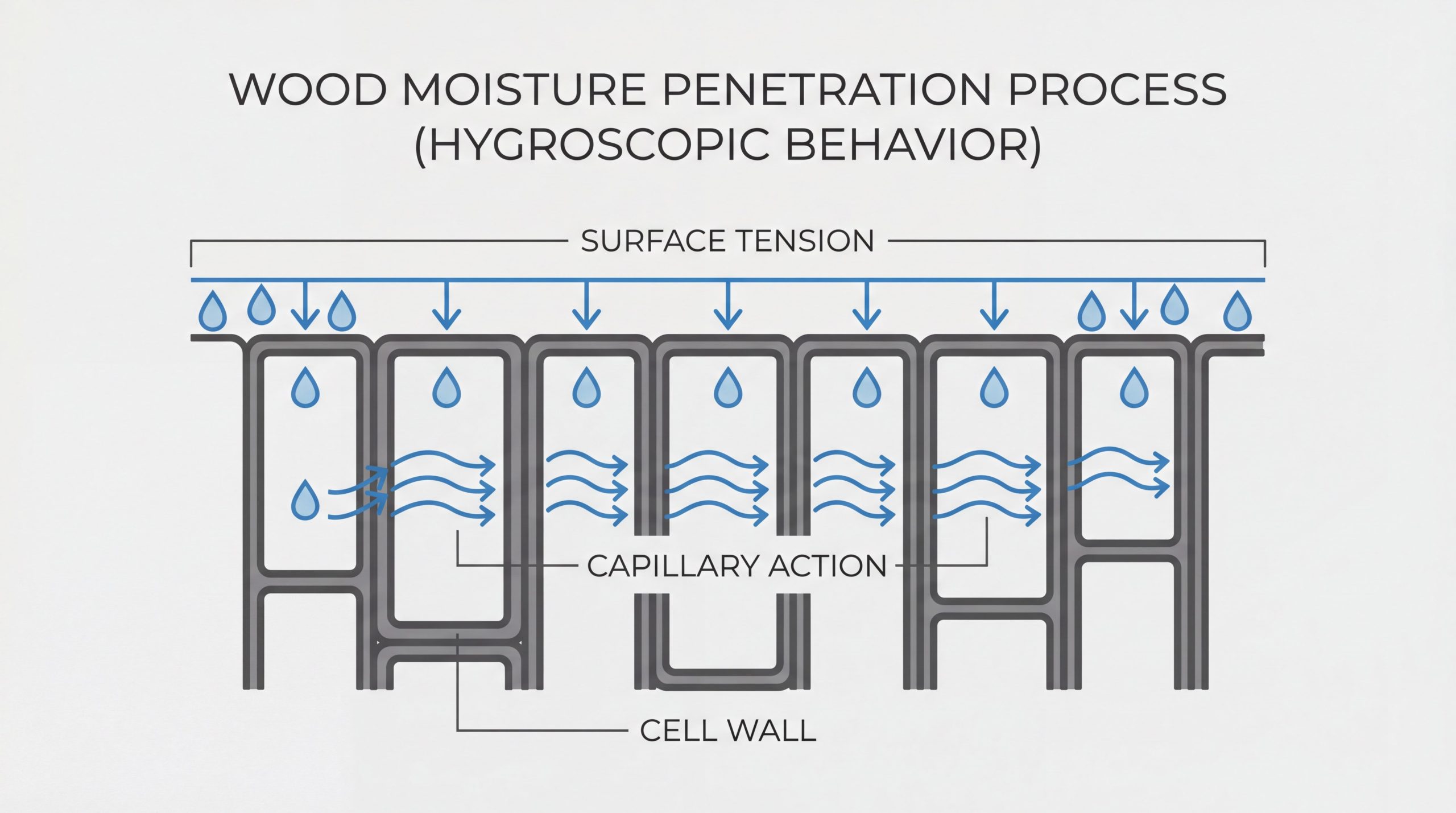 At a molecular level, moisture enters wood through capillary action within the tubular cell structures. These cells, originally designed to transport nutrients, act like sponges when exposed to liquid water or high vapor pressure. End-grain surfaces are particularly vulnerable, as they expose the open ends of these capillaries to the environment.
