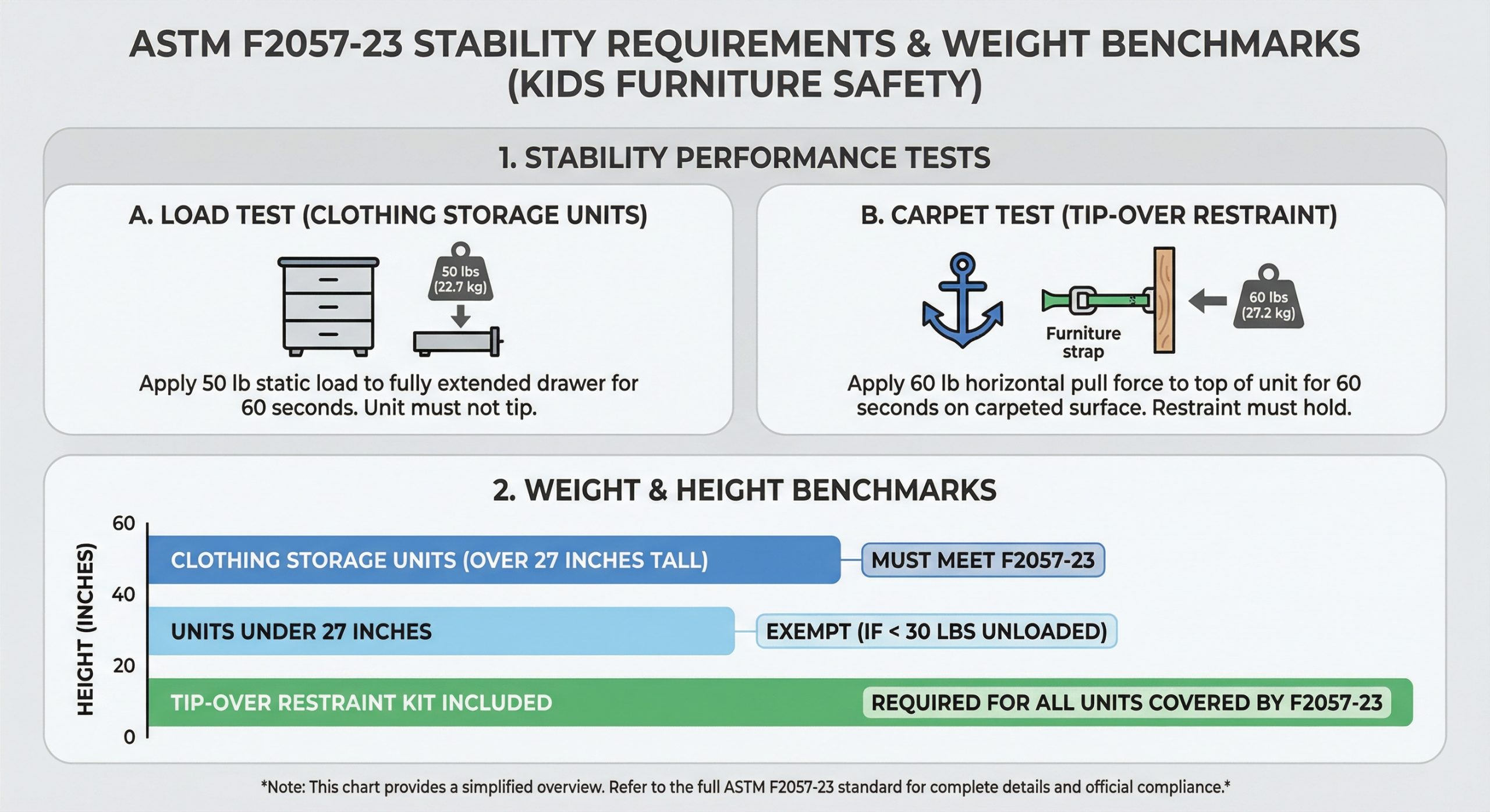 ASTM F2057-23 applies to Clothing Storage Units (CSUs) like dressers and bureaus. The new standard is significantly more rigorous than previous iterations, requiring units to remain stable under three specific conditions:
