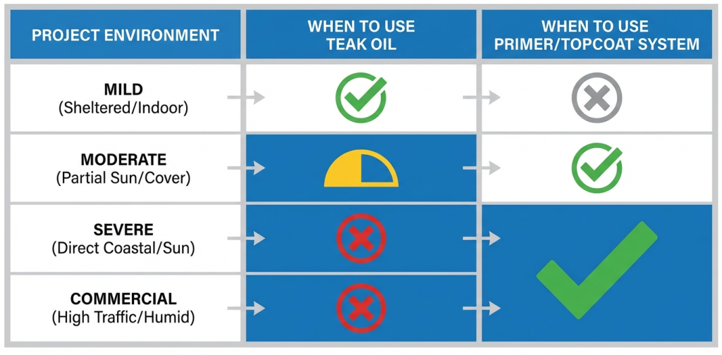 For extreme environments, you should specify “marine-grade” oils which typically contain higher concentrations of resins and biocides compared to consumer-level products. These professional formulations are designed for the deck of a yacht, making them more than capable of handling the demands of a luxury hotel terrace.